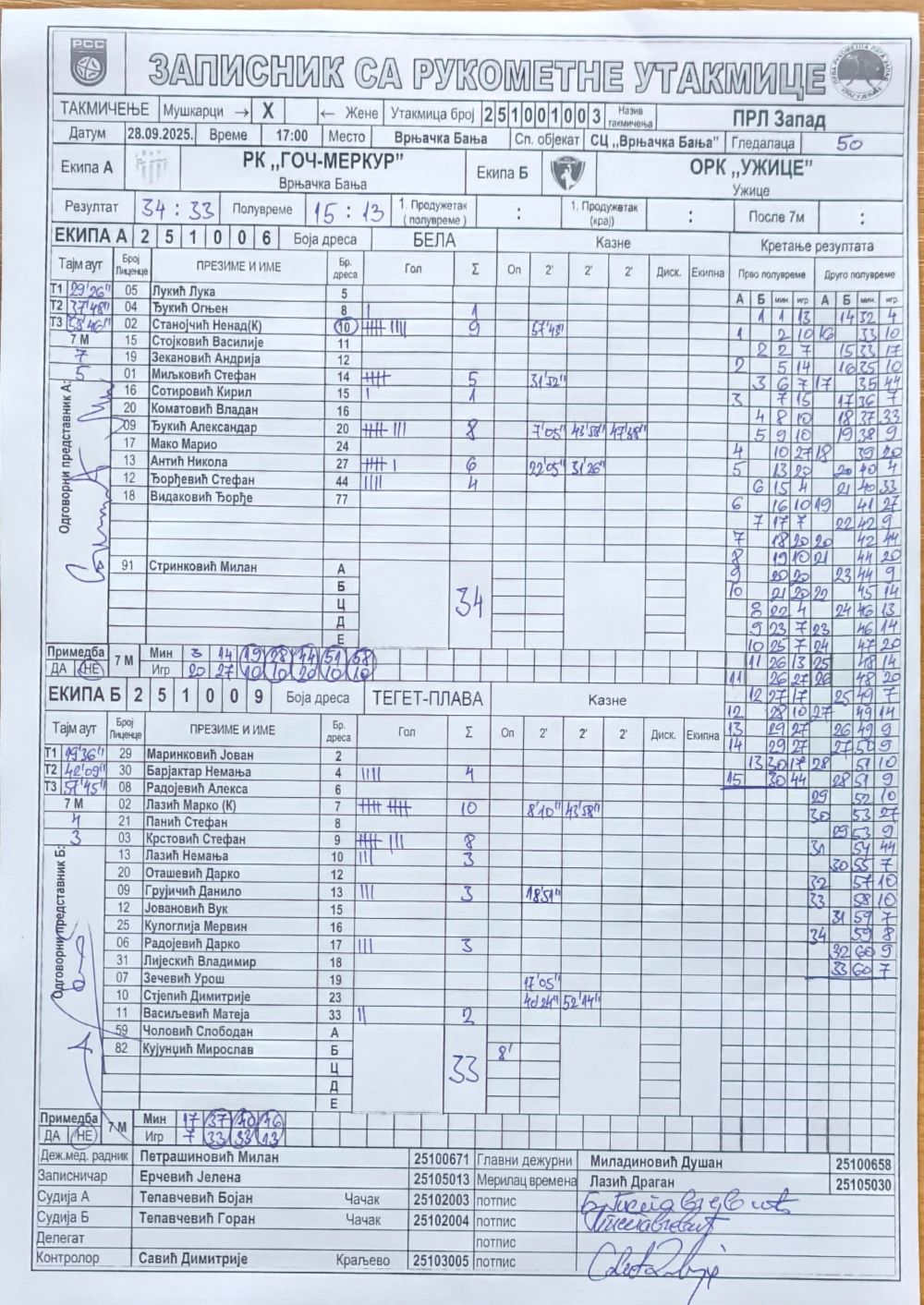 Број утакмице: ПРЛ Запад М 003
