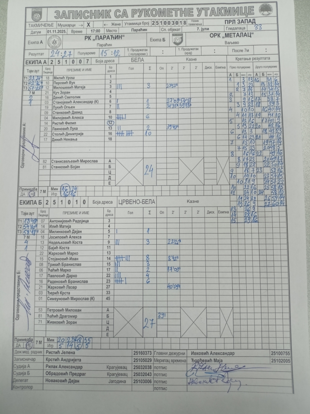 Број утакмице: ПРЛ Запад М 018