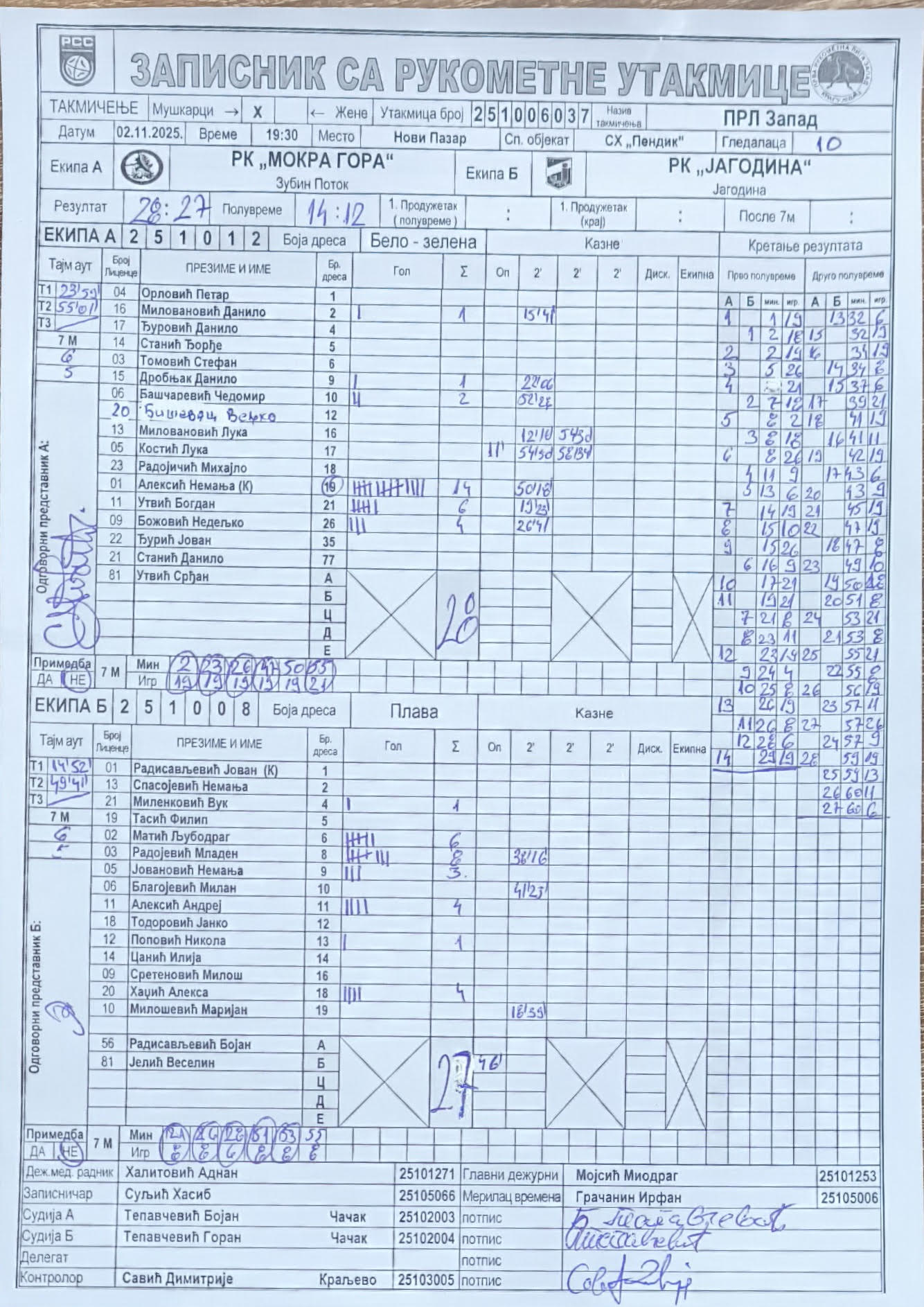 Број утакмице: ПРЛ Запад М 037
