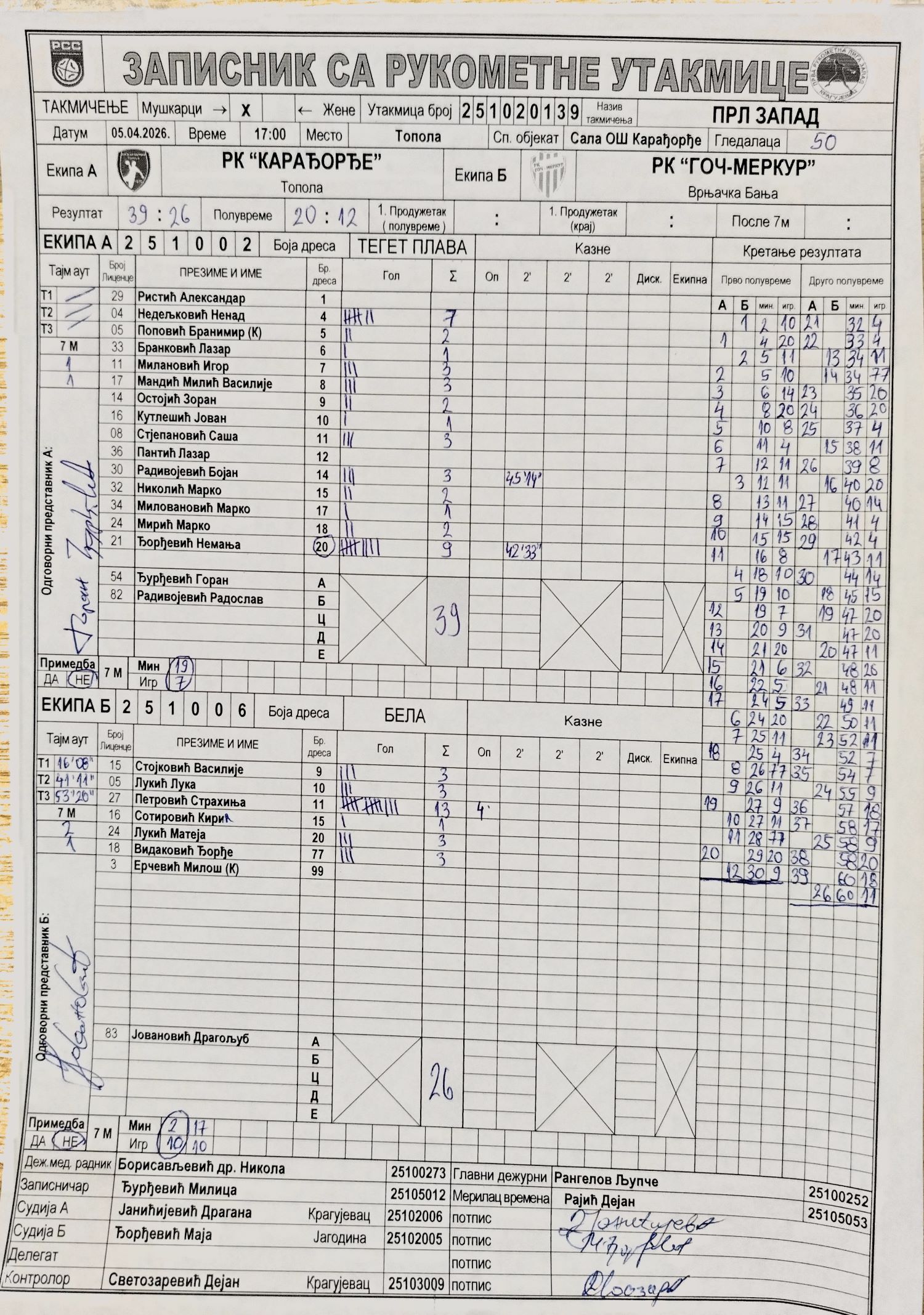 Број утакмице: ПРЛ Запад М 0139