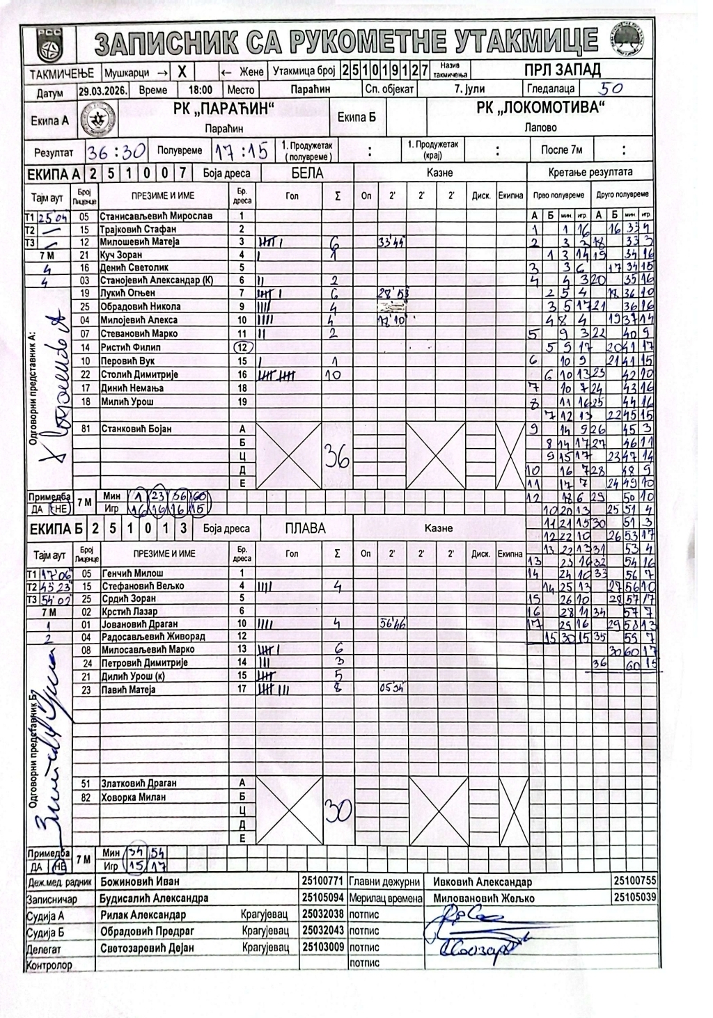 Број утакмице: ПРЛ Запад М 0127