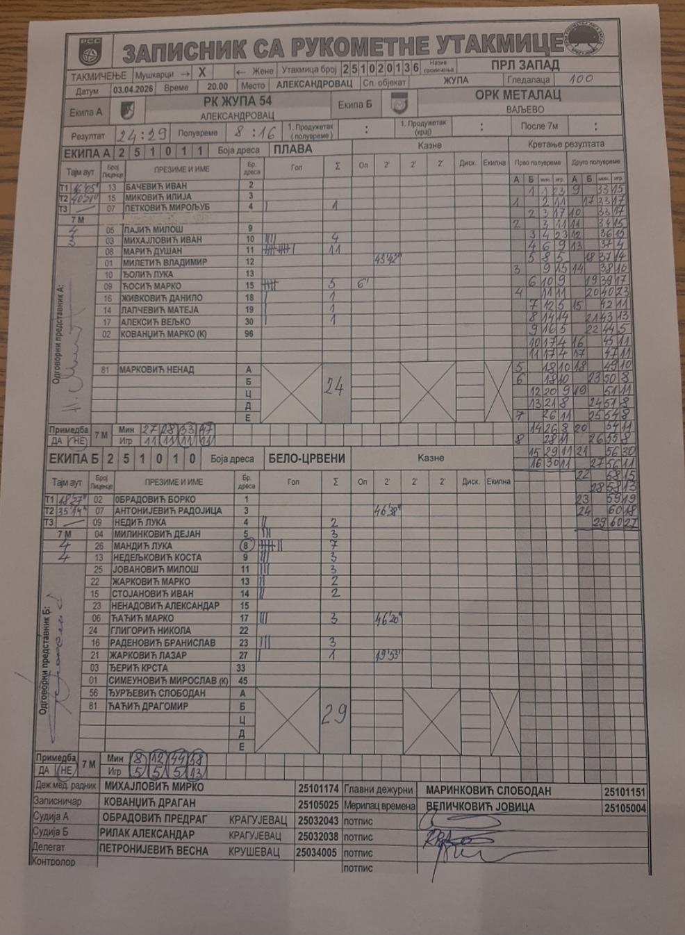 Број утакмице: ПРЛ Запад М 0136