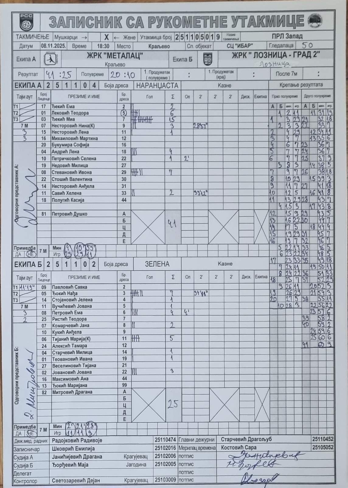 Број утакмице: ПРЛ Запад Ж 019